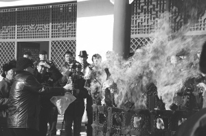 在主祭者的帶領(lǐng)下,男人們排隊走到火壇旁,一邊把自己帶來的白酒、黃油、羊肉等物恭敬地拋入火中,一邊禱告。按照傳統(tǒng),女人們在所有程序都告一段落時,最后走到火壇邊祭拜火神,祈福新春。