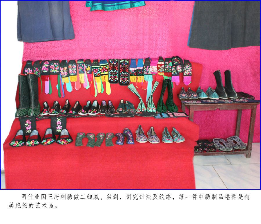 圖什業(yè)圖王府服飾包括:服裝、服飾、鞋帽及馬匹裝飾等?;蛸|(zhì)樸、清新,或漂亮、華貴,或錯落有致;既有山水,又有花鳥,形象逼真,惟妙惟肖,色彩協(xié)調(diào),圖案精美;其做工細(xì)膩獨到,講究針法及紋路,每一件服飾制品堪稱是精美別致的藝術(shù)品。