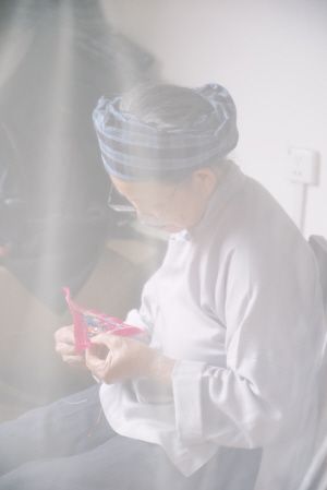 后來,我好幾天都到黃奶奶家,希望她可以染布給我看,但似乎總是機緣不到。一天,在黃奶奶家午睡醒來,隔著蚊帳,看見她側(cè)對著我正在繡花,沉浸在一片溫柔的光暈里。那是黃奶奶的另一項手藝,繡有龍鳳、獅子、蝴蝶、花朵、螃蟹這些吉祥花紋的繡片,會用在小孩背帶上,保佑他們健康長大。家里每個出生的成員都受到美和愛的環(huán)繞。
