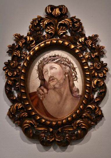 本作品展現(xiàn)的是耶穌被釘在十字架上遭受殘酷折磨的神態(tài)。作者用亂針繡和平繡相結(jié)合的方法,用細(xì)密的排針將耶穌的苦難放大在觀者面前。整個繡面呈現(xiàn)出了靜默而肅穆的氛圍。