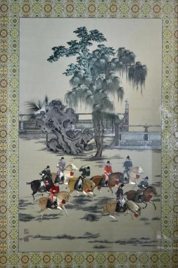 取材于后梁畫家趙喦所作《八達(dá)游春圖》。八人策馬揚鞭于草地間,前者呼,后者應(yīng)。絲縷排列精致細(xì)膩,人物五官不逾寸豆,卻被精巧的一一繡出,神情各異,極為傳神。