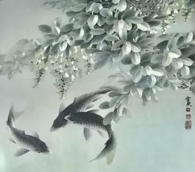 魚是蜀繡中的代表圖案。該繡品針法細(xì)膩,片線光亮,色彩典雅。紫藤花與水中的鯉魚動靜結(jié)合,相映成趣。