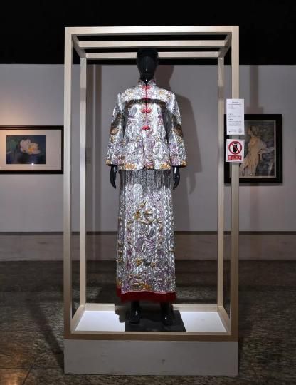 龍鳳褂裙,為女子出嫁與善終之時所穿之物。本作品采用精細(xì)金銀線配以潮繡墊高技法,繡制龍鳳圖案多達(dá)70余只,成為褂裙等級中的最高規(guī)格“褂王”。