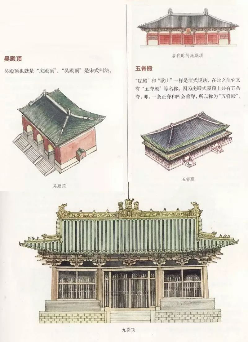 其中廡殿頂最早,約出現(xiàn)于先秦時(shí)期。在商代的甲骨文、周代銅器、漢畫(huà)像石與明器、北朝石窟中都有反映。據(jù)《周禮·考工記》載:“商人四阿重屋”,即早在商朝,已有四阿屋頂,但只是四坡水的茅草房而已。