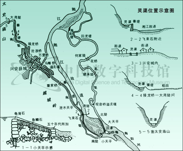 靈渠,又名零渠。以其曾部分利用靈(零)河水系的原有河道,故名。因開(kāi)鑿于秦,一名秦鑿渠。又因位于今廣西興安縣城附近,故近代或稱之為興安運(yùn)河。靈渠是一條連接湘江與漓江的人工渠道,主要由鏵嘴、大小天平石堤、南渠和北渠等工程構(gòu)成。鏵嘴是修建在湘江中的分水壩,用巨石疊砌而成,前銳后鈍,形似犁鏵,這是引湘入漓的關(guān)鍵工程,它有效地使湘江一分為二,一支順南渠入漓江,一支沿北渠回流入湘江。南、北渠總長(zhǎng)三十四公里,是靈渠的主體結(jié)構(gòu),是貫穿湘、漓二水的通道。在鏵嘴尾端還筑有“∧”字的大小天平石堤,起著蓄水、溢洪,調(diào)劑水量的作用,能保證整個(gè)工程發(fā)揮正常的效益。
