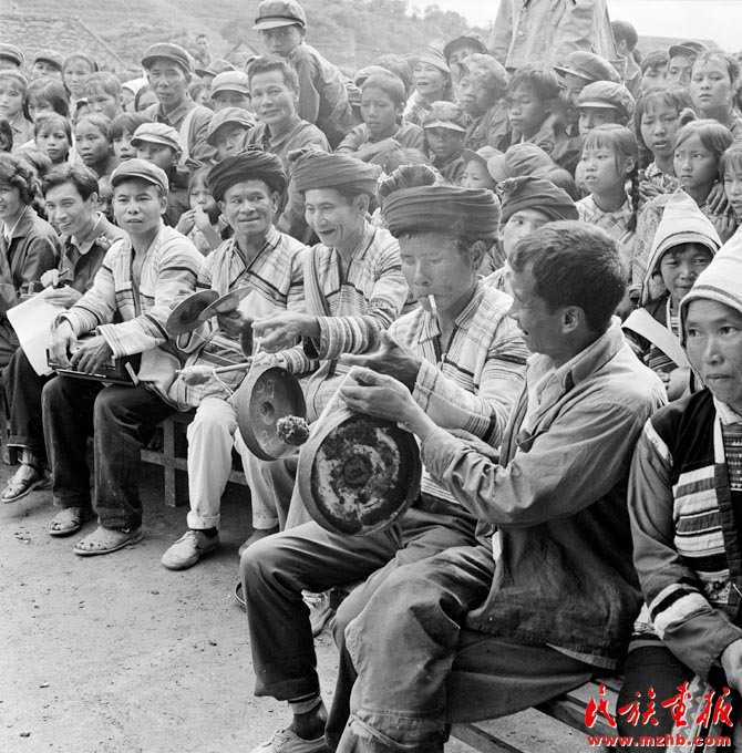 1979年,我國(guó)認(rèn)定基諾族為中國(guó)第56個(gè)民族,圖為基諾族群眾敲鑼打鼓歡慶的場(chǎng)景(中國(guó)民族圖片庫(kù)資料)