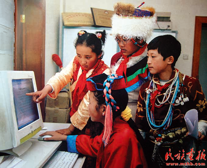 曾幾何時(shí),電腦、網(wǎng)絡(luò)等現(xiàn)代化的交流手段離邊疆少數(shù)民族地區(qū)那么遙遠(yuǎn),隨著經(jīng)濟(jì)發(fā)展、國(guó)民消費(fèi)水平的提高,一些高科技、現(xiàn)代化的事物在普通群眾中輕而易舉地普及了。圖為2007年,西藏門巴族、珞巴族的兒童在學(xué)電腦。(中國(guó)民族圖片庫(kù)資料)