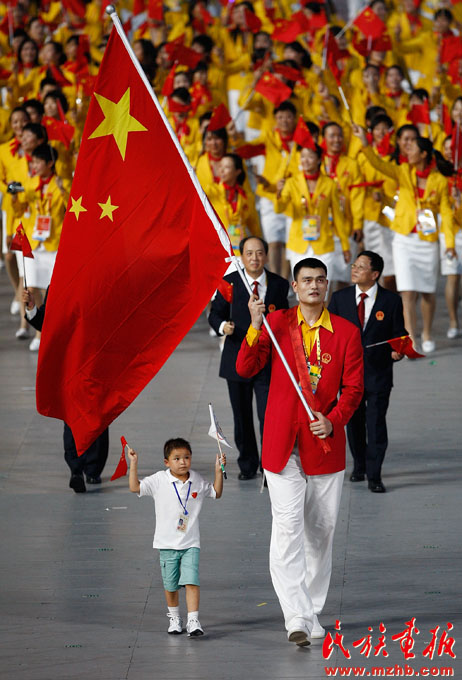 2008年8月8日,全國(guó)各族人民期盼已久的第二十九屆奧林匹克運(yùn)動(dòng)會(huì)在北京隆重開幕,圖為北京奧運(yùn)會(huì)中國(guó)代表團(tuán)入場(chǎng)儀式上,運(yùn)動(dòng)員姚明領(lǐng)著汶川大地震中最小的救人英雄林浩入場(chǎng)?!睹褡瀹媹?bào)》2008年第9期