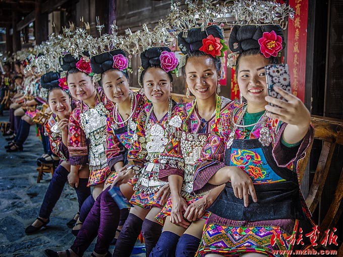 經(jīng)歷改革開放40年的發(fā)展,我國(guó)社會(huì)生產(chǎn)力、綜合國(guó)力、人民生活水平實(shí)現(xiàn)了歷史性跨越,全黨全國(guó)各族人民要更加緊密地團(tuán)結(jié)在以習(xí)近平同志為核心的黨中央周圍,高舉中國(guó)特色社會(huì)主義偉大旗幟,不忘初心,牢記使命,將改革開放進(jìn)行到底,不斷實(shí)現(xiàn)人民對(duì)美好生活的向往,在新時(shí)代創(chuàng)造中華民族新的更大奇跡。圖為貴州民眾盛裝自拍?!睹褡瀹媹?bào)》2018年第3期