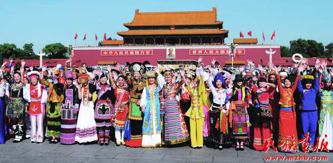 新中國(guó)成立以來,黨和國(guó)家始終堅(jiān)持把馬克思主義民族理論同中國(guó)民族問題具體實(shí)際相結(jié)合,始終堅(jiān)持把民族工作作為一項(xiàng)重大工作來抓,團(tuán)結(jié)帶領(lǐng)全國(guó)各族人民共同團(tuán)結(jié)奮斗,共同繁榮發(fā)展,開創(chuàng)了中國(guó)特色解決民族問題的正確道路,取得了舉世矚目的成就,積累了彌足珍貴的成功經(jīng)驗(yàn)。2009年10月1日,在北京天安門廣場(chǎng),20萬軍民以盛大的閱兵儀式和群眾游行歡慶新中國(guó)60華誕,圖為各民族學(xué)生參加“團(tuán)結(jié)奮進(jìn)”方陣群眾游行?!睹褡瀹媹?bào)》2009年第10期