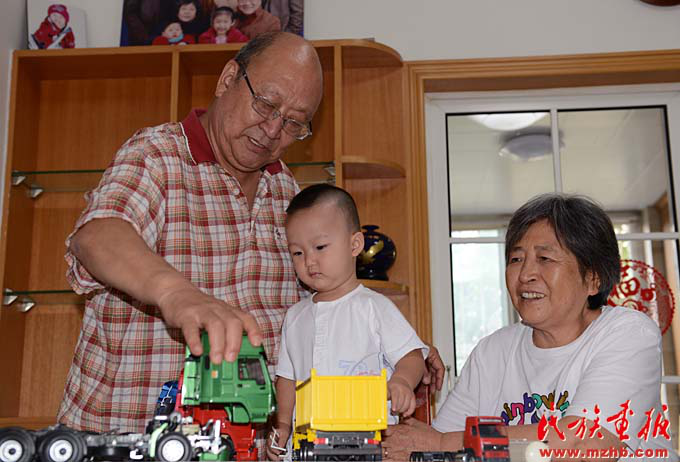 畢大寧與老伴陪小孫子玩車模,這是他們最開(kāi)心的事(陳濤 攝影)