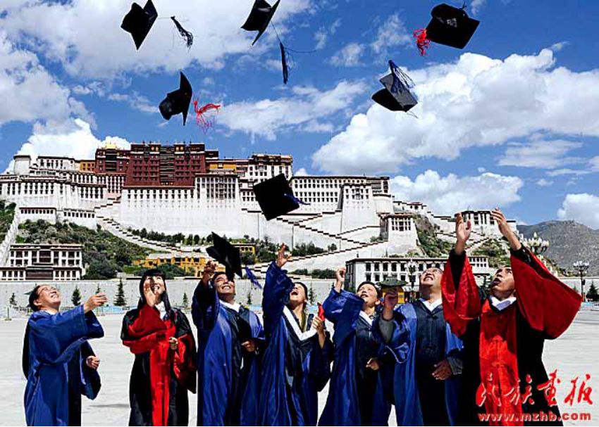 西藏已有普通本??茖W(xué)校7所。西藏大學(xué)一批被授予博士、碩士學(xué)位的學(xué)生在布達拉宮廣場慶祝畢業(yè)