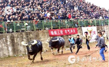 貴州省從江縣第十五屆原生態(tài)侗族大歌節(jié)的前一天,恰逢該縣逢亥斗牛日,丙妹鎮(zhèn)松學(xué)斗牛塘、谷坪鄉(xiāng)四寨河斗牛塘同時(shí)舉辦傳統(tǒng)牛王爭(zhēng)霸賽,喜迎一年一度“侗族大歌節(jié)”的到來(lái),共有來(lái)自周邊村寨的80頭水牯牛參戰(zhàn),斗?;顒?dòng)場(chǎng)上名牛角逐,場(chǎng)面異彩紛呈,吸引數(shù)萬(wàn)名觀(guān)眾前來(lái)觀(guān)戰(zhàn)。