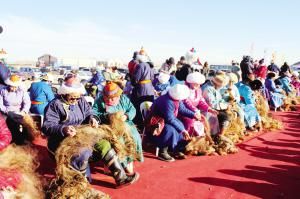 當(dāng)然,后來那達(dá)慕增加了許多新項(xiàng)目,比如賽駱駝、提水、縫蒙古袍扣子、撿牛糞、打斷牛骨比賽、蒙古象棋比賽、沙嘎(羊拐)比賽等。在北京舉辦的那達(dá)慕里,還融入了現(xiàn)代三大球類比賽項(xiàng)目,為了集體參與,增加了拔河比賽、扔沙包、服飾比賽、兒童說蒙古語比賽、兒童唱歌比賽等。
