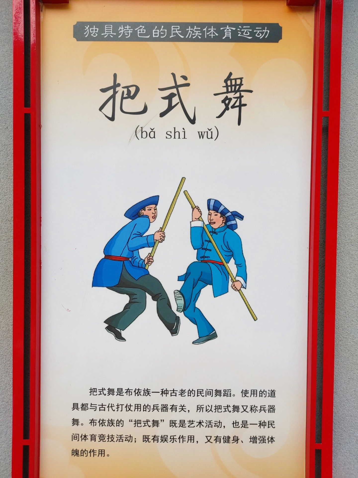 把式舞是布依族一種古老的民間舞蹈。使用的道具都與古代打仗用的兵器有關(guān),所以把式舞又稱兵器舞。布依族的“把式舞”既是藝術(shù)活動(dòng),也是一種民間體育競(jìng)技活動(dòng);既有娛樂作用,又有健身、增強(qiáng)體魄的作用。