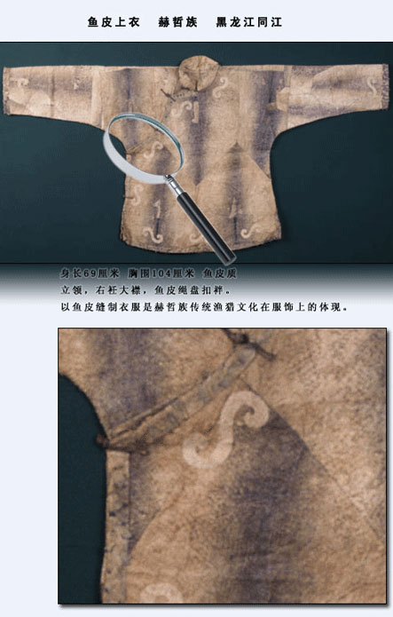 赫哲族的魚(yú)皮衣歷史久遠(yuǎn)。我國(guó)古代文獻(xiàn)《山海經(jīng)》第九卷《海外東經(jīng)》中便有“玄股之國(guó),在其(黑齒)北,其為人衣魚(yú)食鷗” 的記載?!耙卖~(yú)”西晉學(xué)者郭璞解釋為“以魚(yú)皮為衣也?!闭f(shuō)明早在兩千多年前,赫哲族的先民就已使用魚(yú)皮做衣服了。另?yè)?jù)密山新開(kāi)流新石器時(shí)代遺址中出土的魚(yú)叉及骨針,證明赫哲族的先民捕魚(yú)和縫制魚(yú)皮衣有數(shù)千年歷史了。清代張晉彥的《寧古塔山水記》有:“魚(yú)皮部落,食魚(yú)為生,不種五谷,以魚(yú)皮為衣,暖如牛皮”的記載。《皇清職貢圖》記載:“赫哲衣服多用魚(yú)皮而緣以色布,邊綴銅鈴,亦與鎧甲相似?!绷硗猓胤街緯?shū)對(duì)此也多有記載。可見(jiàn),赫哲族制作和穿著魚(yú)皮衣是真實(shí)而久遠(yuǎn)的。