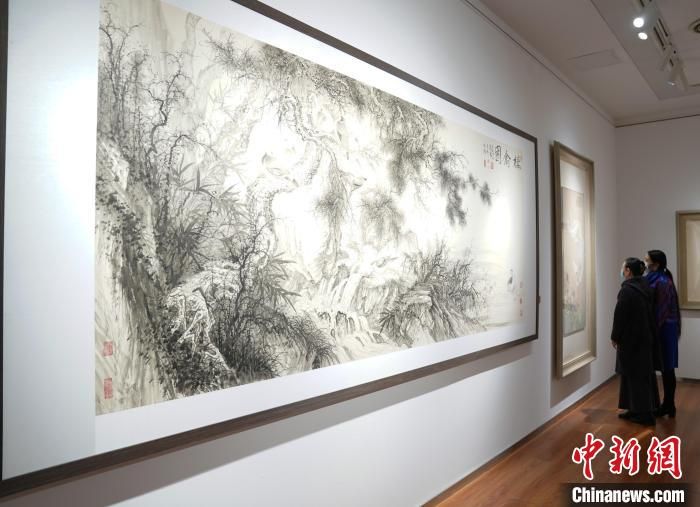 在展覽上,為慶祝中國藝術研究院建院70周年,田黎明和許俊,??苏\、周石峰、任清和曾三凱,劉萬鳴和劉彥水,趙建成、崔進和劉少寧分別合作的《新綠》《千巖霞映》《棲禽圖》《我見青山多嫵媚》4幅丈二尺幅的中國畫同時亮相。