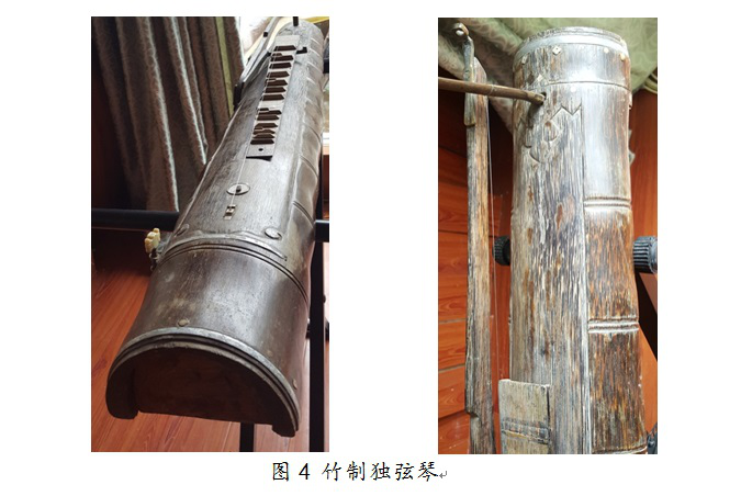 京族獨弦琴的制作工藝傳統(tǒng),其材質(zhì)有竹、木質(zhì)兩種。竹制獨弦琴的琴體通常取大斑竹為原料,制作時選粗細勻稱、質(zhì)地密實的一段竹子,截長為120厘米左右長度,再劈成1/3和2/3兩部分,取2/3部分的竹筒進行打磨、打孔,再安裝竹制搖桿、麻繩或竹篾削制的琴弦,竹質(zhì)獨弦琴即制成;木質(zhì)獨弦琴的琴體多選生長于當(dāng)?shù)氐耐┠緸樵牧?,取長約100-120厘米的木料,切割成數(shù)塊木板,打磨后將木板拼成長方形木匣為琴身,一端插上一根與琴身呈直角的、用牛角制成的弧形柱子,圓柱上安裝一瓢型(葫蘆形)共鳴器,再將一根金屬絲從瓢中心引向琴的另一端,固定在的弦鈕上,木質(zhì)獨弦琴即制成。