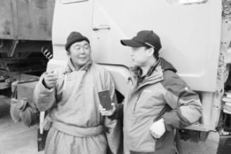 2017年,王玉龍(右)在內蒙古二連浩特采訪蒙古國卡車司機。 受訪者供圖