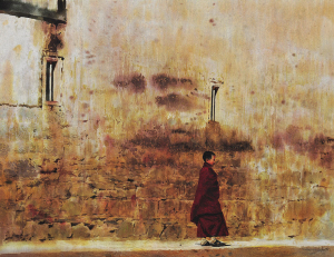 在麗江的束河古鎮(zhèn),他坐在小溪邊,吹著清涼的微風,聽著對面咖啡屋傳來的低吟慢唱,心情舒暢地畫著自己的畫。很快,一幅《水邊咖啡屋》就在這不經意間誕生了。在梅里雪山,早晚都能看到人們所說的日照金山的美景,打開窗戶,暖陽透進來照在身上,就這樣畫著藏族人心中的神山,他覺得實在找不出還有比那一刻更美好的感覺了。