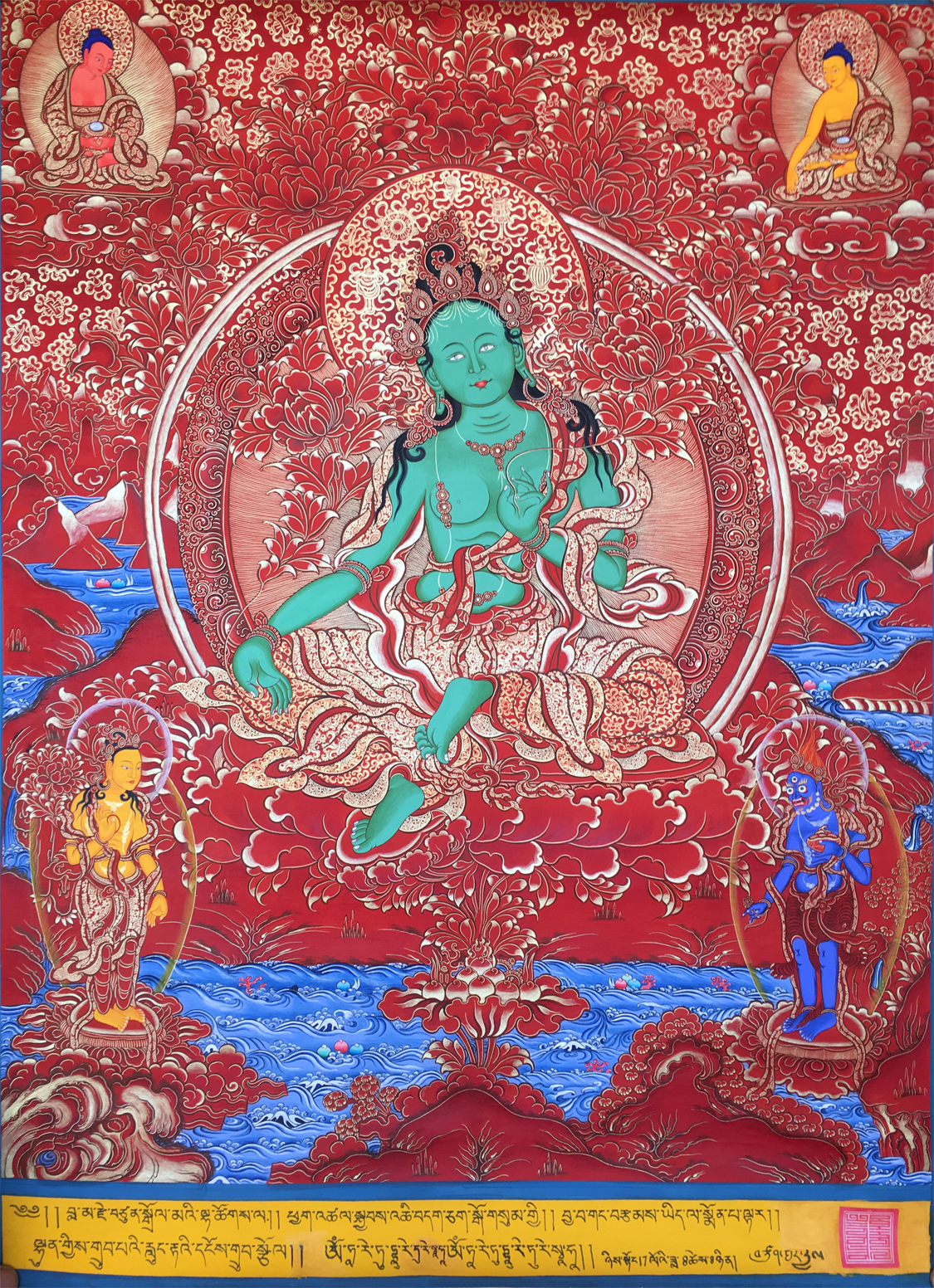 綠度母即觀世音菩薩之化身,為二十一度母之主尊,持通本尊咒,能總持二十一度母之功德。修持此尊密法,能斷生死輪回,消除一切魔障、業(yè)障,并能消災增福,延壽廣開智能,凡有所求無不如愿成就,且命終往生極東世界。唐朝的文成公主咸信是綠良母的化身。