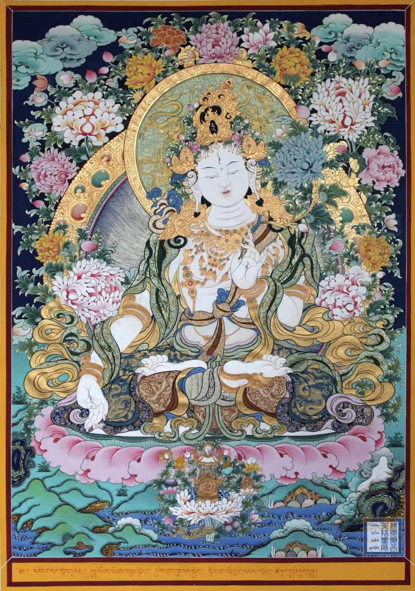 白度母,藏語稱“卓瑪嘎波”, 膚色潔白,玲瓏剔透,身放五光,溫靜微笑,相貌顯得青春年少,七只慧眼個個如菊花花瓣大小,這些眼象征她能觀照一切眾生。一面二臂,右手結(jié)施愿印,以示救助。左手拇指與無名指牽住白蓮花枝對著心間,花開至耳旁;美麗動人,乳房隆起;以白珍珠為主的各種寶貝分別作為頭飾、耳飾、項飾、胸飾、腰飾、手鐲、腳釧;佩戴鈴串、天物之花;上穿白絲,下著錦裙;秀發(fā)后束,頂髻飄逸;月亮靠背,結(jié)金剛跏跌危坐。