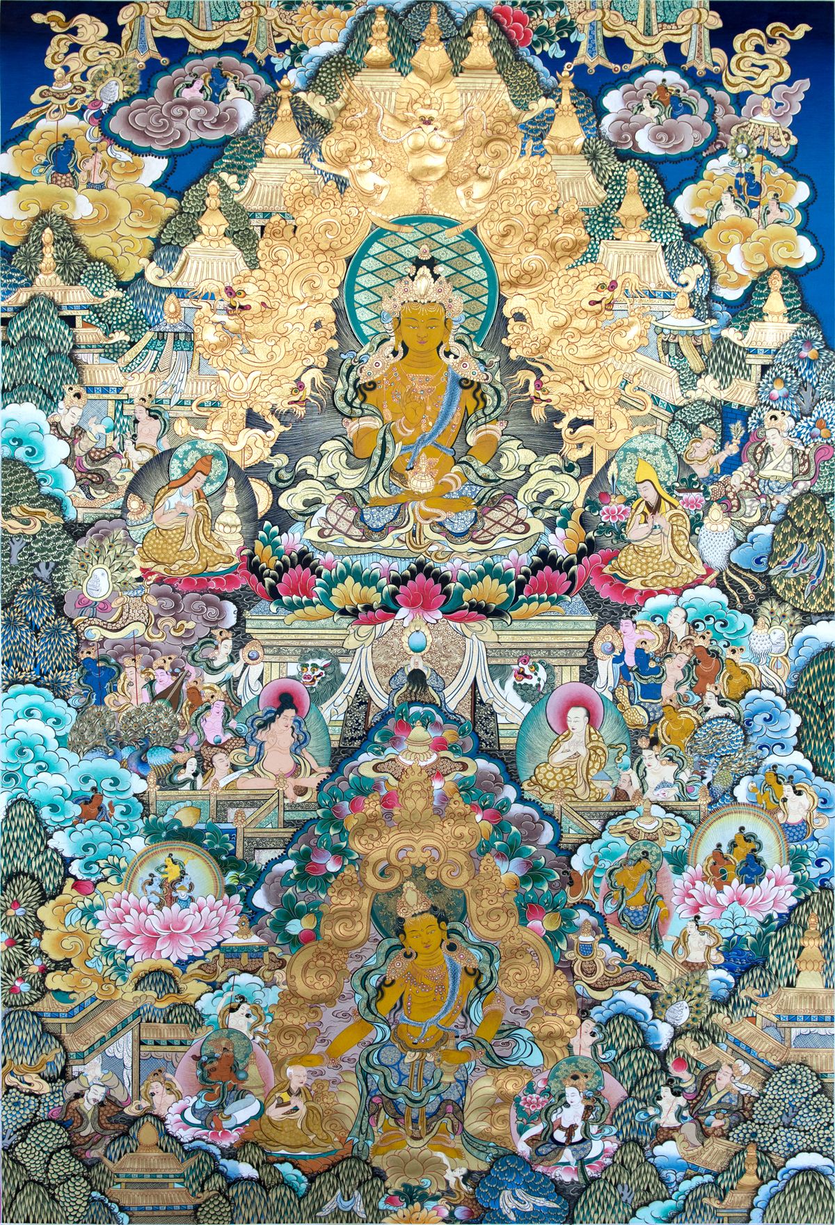 主尊未來世界彌勒佛菩薩,左邊描繪了噶當(dāng)派創(chuàng)世者阿底峽尊者與他的弟子。右邊描繪了格魯派的創(chuàng)世者宗喀巴大師與兩大弟子克主杰和迦側(cè)杰,中部周圍供奉者八大隨喜菩薩文殊菩薩、普賢菩薩、觀世音菩薩、金剛手菩薩、虛空藏菩薩、地藏菩薩、彌勒菩薩、除蓋障菩薩,畫面四角供奉為彌勒佛未來世界的迎接與弘揚(yáng)佛法的情景。畫面上空描繪了仙女四處飛揚(yáng),空中漂浮著吉祥的圖案與神秘的瑞相等等。整體畫完之后選擇一個殊勝吉祥的日子點所有諸佛的五官,發(fā)髻、手勢、法器、畫面后部畫家要親自寫聲、語、法的字號。作品完工之后寺院里進(jìn)行眾多活佛和高僧大德的加持與開光儀式。