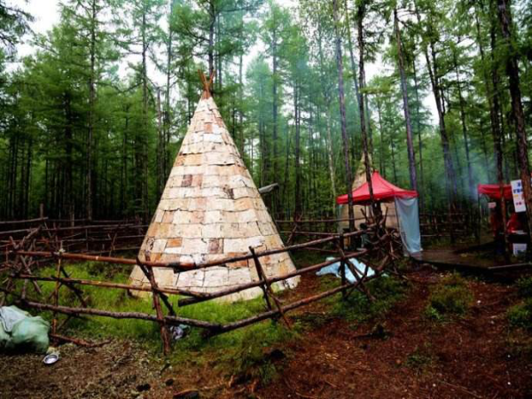 撮羅子的選址,是在地勢較高、陽光能照射到而且水和柴草就近可取的平坦之處。其蓋造方法,是用三五根約碗口粗細(xì)上有枝杈的木桿,相互交合搭成上聚下開的骨架,然后再用30根左右木桿搭在骨架之間捆綁固定,在南面(或東面)留出門,即基本成型。木桿搭起的只是“屋架”,外面還要覆蓋才能遮風(fēng)擋雨。按照季節(jié)的不同,分別用樺樹皮、草簾子和犴、狍等獸皮,做成自上而下一層壓一層的圍子,綁在木桿上,門簾則夏用草或樹條編,冬用狍皮做成。