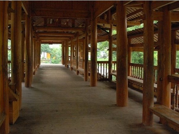 風(fēng)雨橋以石拱木作,廊、屋、亭、閣為一體,造型別致、美不勝收。無論是遠(yuǎn)眺還是進(jìn)觀,都體現(xiàn)出獨(dú)特的審美意境。鏈接廊橋與屋亭的是長(zhǎng)條青石,橋與村寨的連接則用花石鋪路,橋面主體是當(dāng)?shù)厮寄静?。這種自然生態(tài)環(huán)保的理念,更彰顯了瑤族人民獨(dú)特的審美境界。