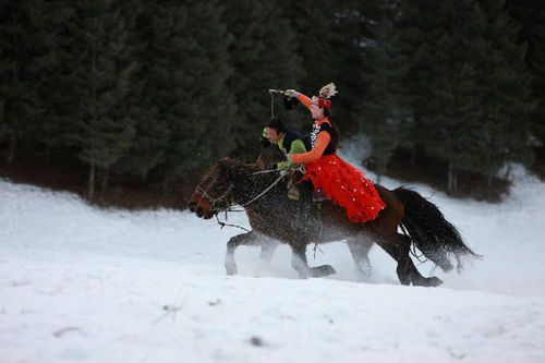 在傳統(tǒng)的竟技比賽場(chǎng)上,最激動(dòng)人心的還是“姑娘追”它往往是全場(chǎng)比賽的壓軸戲?!肮媚镒贰?據(jù)說(shuō)是由上古“追姑娘”的風(fēng)習(xí)演變而來(lái),至今既是哈薩克人最喜愛(ài)的娛樂(lè)項(xiàng)目,又是小伙子找對(duì)象談情說(shuō)愛(ài)的好機(jī)會(huì)。