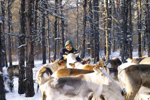 人類馴養(yǎng)馴鹿的歷史有1000多年。這是一種異常勇敢的生靈,生活在北極圈附近,分布在歐亞和北美大陸及一些大型島嶼。在極度惡劣的自然條件下,馴鹿為了繁育后代,每年都要冒著生命危險(xiǎn)長(zhǎng)途跋涉數(shù)百里,其堅(jiān)韌不拔的意志力和不屈不撓的品格正是北極冰原精神的象征。在中國(guó),馴鹿棲息在大興安嶺北段的寒溫帶針葉林中,處于半野生狀態(tài),這里有激流河、阿穆?tīng)柡印秃?、呼瑪河,有阿龍山、奧克里堆山等。食物主要是苔蘚,也吃石蕊、蘑菇及大木植物的嫩枝葉。鄂溫克族的祖先把鹿視為圣潔,賦予其許多美麗的神話和傳說(shuō)。是啊,只要有了馴鹿,鄂溫克人便是幸福的。據(jù)考證, 我國(guó)的馴鹿與貝加爾湖東北部尼布楚河上游溫多苔原高地的馴鹿有淵源關(guān)系??梢哉f(shuō),鄂溫克人的馴鹿、狩獵、樺皮文化、薩滿教把北極文化延伸到了興安嶺。