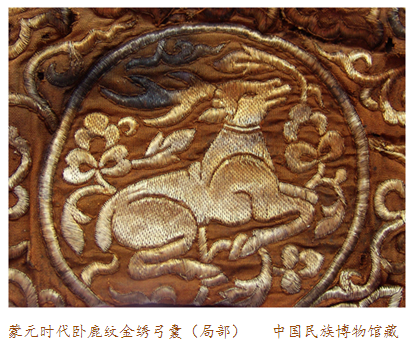 如果說在回回織工梭下的納石夫圖案總是帶有濃郁的伊斯蘭風(fēng)情,而我們在這只金繡撒袋上見到的臥鹿紋,則已是純粹中國特色的春水題材了。它是出自一位已經(jīng)深受中華文化濡染的回回繡女之手?還是一位已是織金高手的中原繡娘穿針引線完成了它?不論怎樣,在文化大交流、民族大融合的時代里,這只金繡撒袋顯露出中西文化合璧一體的氣息。