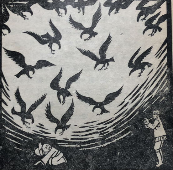 誰知笛聲一響,成群的兀鷹像是聽了誰的召喚,黑壓壓的一大片,直往奴隸主頭上飛來。奴隸主知道,只要鷹落下來,自己就沒命了,便急忙向娃發(fā)求饒道:“快把鷹叫開,你要啥我給啥!”娃發(fā)隨口說道:“給達(dá)卜達(dá)爾的塔吉克人每家十只羊,十頭牛,十峰駱駝,行嗎?”奴隸主連忙點頭:“行!行!要什么都給?!边@時,娃發(fā)又吹起了“鷹笛”,鷹群才飛走了。