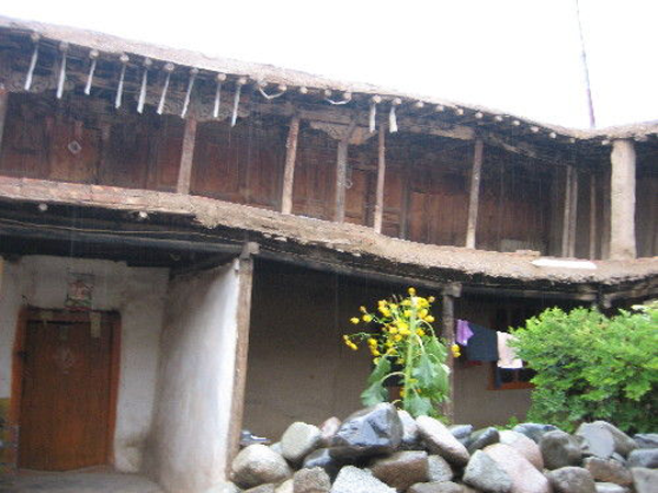 為改善狹小的寨內(nèi)空間,當(dāng)?shù)鼐用窬藿硕幽窘Y(jié)構(gòu)樓房,和青海鄉(xiāng)村民居庭院寬敞的特點(diǎn)形成了反差。寨內(nèi)民居庭院多為四合院式,房屋為土木結(jié)構(gòu)平頂房,一般民居都有飛椽花藻之類。屋內(nèi)一般以木板作隔扇,室內(nèi)有護(hù)炕木板、護(hù)墻木板墻圍,且多雕花草于其上。房屋一般面闊三間,正面以木板隔墻并裝上木板條方格小花窗。佛堂設(shè)在二樓,佛堂所在的房屋一般都是上房,和佛堂不同向的兩邊廂房一般做臥室。院落中央一般都有豎掛經(jīng)幡的旗桿,還設(shè)有桑臺(tái),具有明顯的藏式特點(diǎn)。