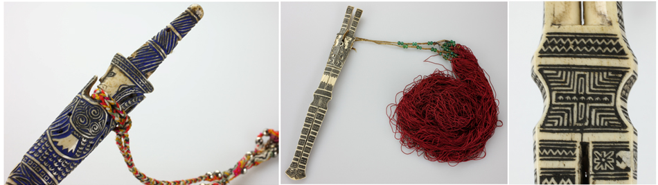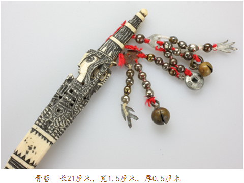 骨簪頭部以下是充滿幾何感的水波紋、山形紋、米字紋、圓形紋,留白之處有魚紋、花紋以及少許文字。文字或是雕刻者本人,或是其心愛之人。一般頭像處或中部系有幾束彩色料珠的紅纓穗飾物用以盤繞發(fā)髻上,或是以銀鈴、銀片來(lái)裝飾。