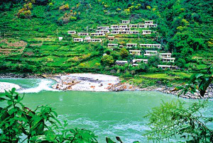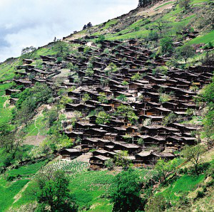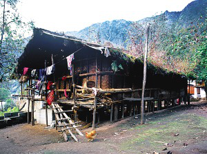 在怒江上游峽谷聚居的傈僳村寨都建在高山的半山上,其民居俗稱為“千腳落地房”。說“千腳落地”雖有些夸張,但也足以形象地說明峽谷溫?zé)岬臍夂蚝蜕礁咂露傅牡乩項l件。在雨季時,“千腳”阻力最小,使山洪順利傾瀉而下,又很快干爽,免受潮氣。而且不需挖地動土,不必移石砌墻,對木料沒有過高要求,長短皆用,在生態(tài)脆弱的高山峽谷也算環(huán)保建筑?!扒_落地”是因建房時先在確定的屋基上依斜坡程度和住房面積打進(jìn)數(shù)十根到百余根木樁為基樁,以保證居室樓板的平正?;鶚洞蚝煤螅拿媪魩赘咧鳛檎麄€房屋的立柱外,在密集木樁所形成的平面上滿鋪竹篾編織的樓板,還有竹篾圍墻,所有結(jié)構(gòu)皆用竹篾綁扎。屋頂鋪苫草或蓋木片瓦,近幾年,已陸續(xù)換上了大塊的水泥波形瓦。房門開在山墻一側(cè),有廊道,可做曬臺,平時穿的衣服都搭在這兒,也是婦女做針線活的地方。隨著怒江峽谷的開發(fā)和新農(nóng)村建設(shè)的深入,通路的村寨將很快會改變面貌。