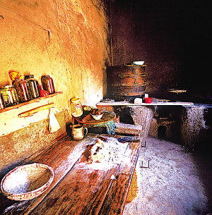 居室內(nèi)紅箱、畫柜耀人奪目,墻上掛有阿拉伯文字的對聯(lián)。屋檐下的臺階上,始終放著一個隨時(shí)洗手洗臉用的“湯瓶”,既節(jié)約又清潔。東西偏屋為晚輩居住,南邊為牲畜和草料房。東鄉(xiāng)人認(rèn)為家居四方平正,財(cái)源廣,子孫榮,門庭興旺。廚房是獨(dú)立的,砌鍋灶,有大案板,方便以面食為主的飲食習(xí)慣。