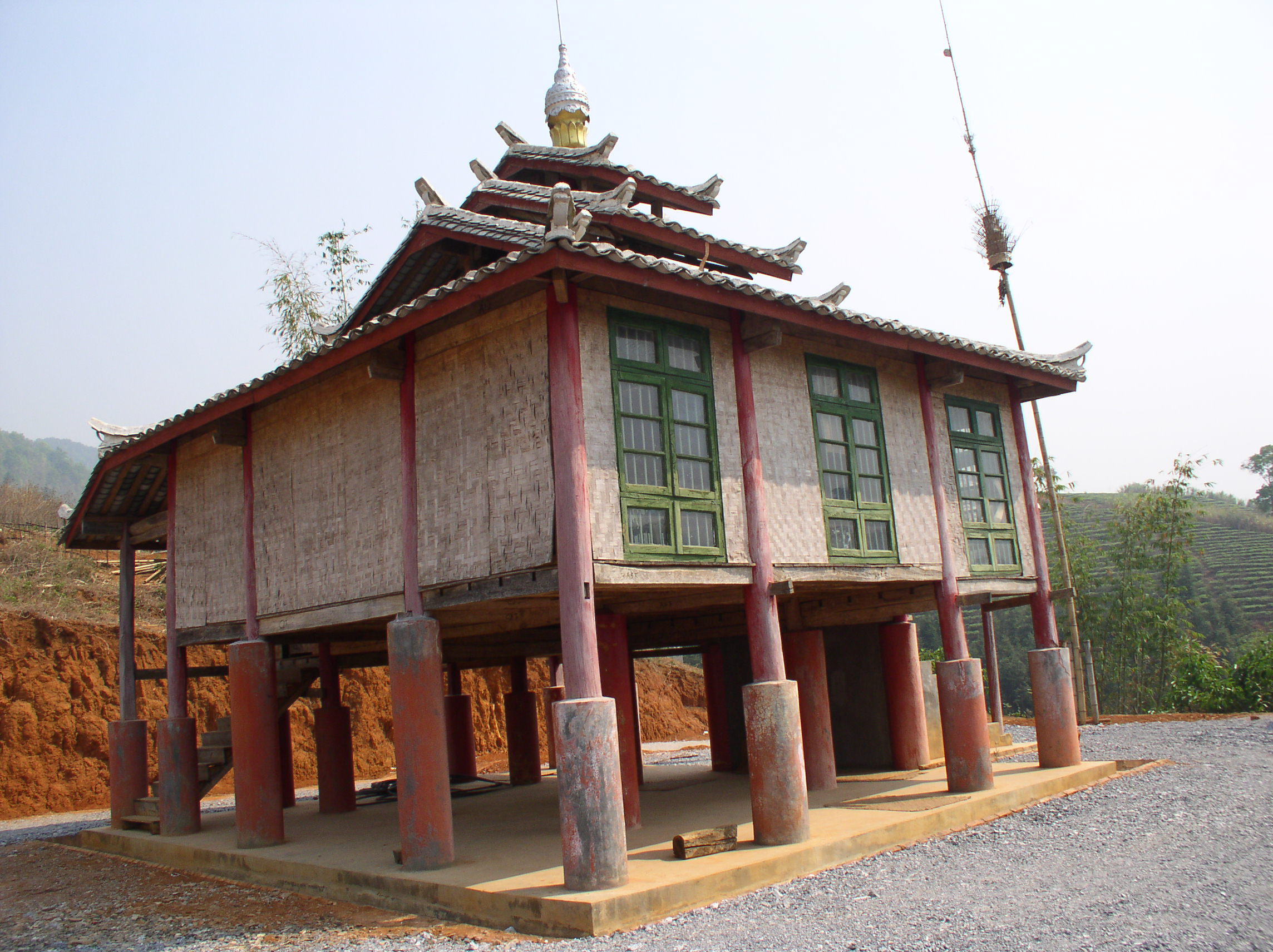 德昂族的家庭民居多為竹木結構、歇山式草頂的干欄建筑,平面有長方形、半圓形、弧形等多種風格。干欄式民居分上下兩層,上層住人、下層作畜廄,有主副兩座樓梯。歇山式草頂為圓弧形的民居,當地稱“氈帽形”,風格粗獷。民居構架為穿斗式木梁柱,樓面、隔間均用竹片或木板鋪設。在德宏等地是一家一院,主房樓上住人、煮食、貯藏糧食,樓下關牲口;附房用作堆放柴草和安裝舂米用的腳碓。鎮(zhèn)康地區(qū)若干小家庭同住一幢房子,房內中間有寬敞的走道,兩旁為各小家庭住室,間壁而居,各有火塘,所以竹樓較大,有的占地近400平方米。20世紀50年代以后,這種竹樓建筑已有改變,現在部分德昂族的住宅與附近漢族的平房一樣。德昂族信仰佛教,有些村莊里建有寺廟,每逢佛事活動人們就來到寺廟里,舉行隆重的儀式。