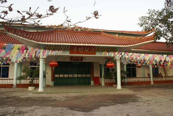 澫尾哈亭是京族哈亭中最為講究的一個。哈亭的頂部呈“八”字形兩面坡,是先用鋼筋水泥鋪平,然后再蓋上土紅色琉璃瓦,四角建成飛檐。屋脊正中立有“雙龍戲珠”雕塑,哈亭大門門楣上掛的是書寫有“哈亭”二字的大牌匾,旁邊的墻體上用紅漆寫明哈亭建造的相關(guān)情況。哈亭正門前有一敞開式的小亭,作為哈亭的輔助裝飾部分,可用于哈節(jié)期間接待來賓休息。小亭的門楣上掛有一塊小牌匾,上書金黃色的“澫尾哈亭”字樣,頂部也立有彩塑“雙龍戲珠”,不過此彩塑沒有哈亭大門正上方頂部的“雙龍戲珠”大。