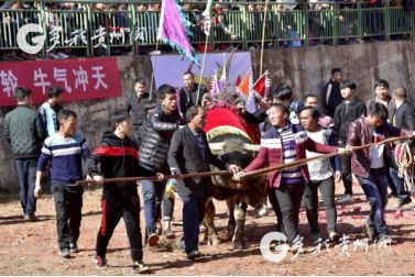 貴州省從江縣第十五屆原生態(tài)侗族大歌節(jié)的前一天,恰逢該縣逢亥斗牛日,丙妹鎮(zhèn)松學斗牛塘、谷坪鄉(xiāng)四寨河斗牛塘同時舉辦傳統牛王爭霸賽,喜迎一年一度“侗族大歌節(jié)”的到來,共有來自周邊村寨的80頭水牯牛參戰(zhàn),斗?;顒訄錾厦=侵?,場面異彩紛呈,吸引數萬名觀眾前來觀戰(zhàn)。