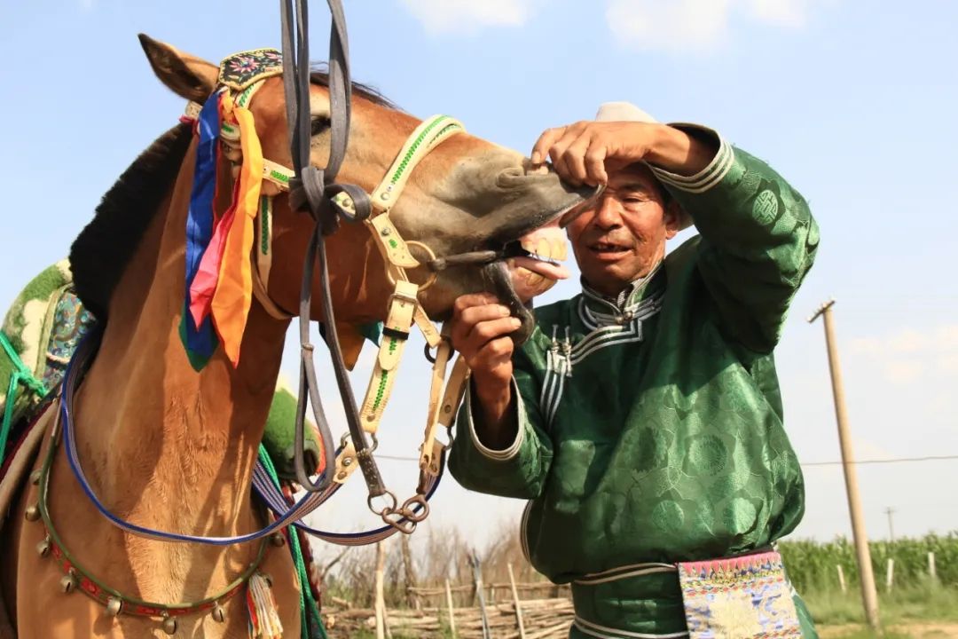 馬的交叉行走分為兩種。一般情況下,馬的右前腿和左后腿同時往前走,左前腿和右后腿并前行叫作“通西業(yè)”;左前腿和后腿并行或右前腿和后腿并行叫作“走馬式行走”。走馬分為賽布日吉擾、海日查格吉擾、德古日吉擾、塔拉吉擾、胡日頓吉擾等5種。小走是走馬中最簡單的行走方式,不費多大力氣。海日查格吉擾是在小走的基礎(chǔ)上稍微快一點兒的行走方式,這是馬天生的步式之一。德古日吉擾是在賽布日吉擾和海日查格吉擾的基礎(chǔ)上訓(xùn)練出來的走馬步式。把這種步式再加訓(xùn)練,比之前稍快,達到能進入賽場的程度時就稱為塔拉吉擾。馬的塔拉吉擾還存在于訓(xùn)練階段,只有經(jīng)過進一步的訓(xùn)練才能使馬的四肢之間的距離保持均衡,成為胡日頓吉擾(快走馬)。