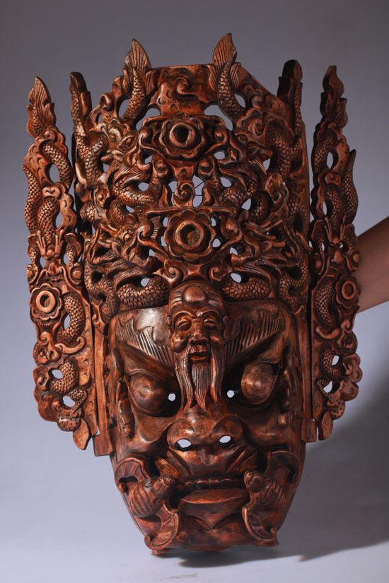 描述:程咬金,字義貞,原名咬金,后更名知節(jié)。驍勇善戰(zhàn),歷史上是唐朝開國名將,以“三板斧”的形象在民間廣為流傳。在地戲唱本《薛仁貴征東》和《薛丁山征西》中,均有程咬金的出場。根據(jù)《隋唐演義》的內(nèi)容,程咬金雖然頭腦簡單,卻是個有福之人,被認為是福將,所以在地戲面具的刻畫上,在嘴角兩側(cè)雕刻上一堆蝙蝠,以取“福”的諧音。又因為程咬金在唐代算是長壽之人,故爾額頭上刻一壽星,帶給人福壽雙全的吉祥含義。