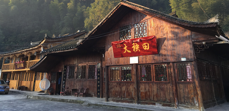 進(jìn)入蘭田村,村口豎立著“利川紅第一村”的牌樓。這個(gè)村的村民靠茶葉吃飯,村里有“利川紅”品牌茶葉近3600畝的種植基地。車?yán)^續(xù)緩緩向前,繞過幾個(gè)急彎、爬上一段緩坡后,一座古色古香的木屋出現(xiàn)在眼前。木屋背靠山,有寬敞的院落,紅褐色的墻體被青山翠竹映襯得格外醒目。木屋正中,一塊朱紅色的大牌匾上用黃色油彩寫著“大秧田”三個(gè)字,使人眼前一亮、心頭一熱,情不自禁地想要走進(jìn)它。