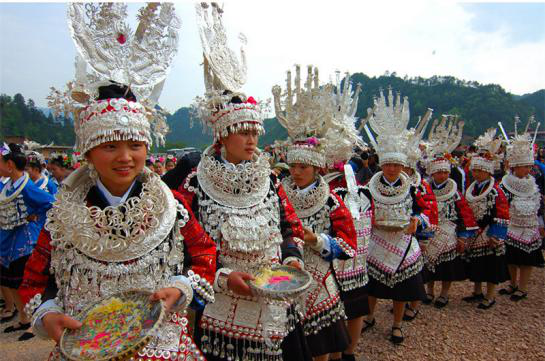 銀飾作為苗族最喜愛的傳統(tǒng)飾物,主要用于婦女的裝飾,品種多樣,分為頭飾、面飾、頸飾、肩飾、胸飾、腰飾、臂飾、腳飾、手飾等,彼此配合,體現(xiàn)出完美的整體裝飾效果。苗族銀飾常出現(xiàn)于苗族的喜慶場合,蘊(yùn)涵有避邪趨正、納福迎祥的寓意,具體生動地反映著苗族人民的生存狀況、精神面貌和審美心理,具有很高的歷史文化研究價值。在對外交往中,苗族人民把銀飾作為禮品贈送友人,和藏族的哈達(dá)、漢族的珠寶一樣珍貴。