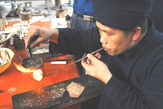 鑄煉:將銀料放在“銀窩”(坩堝)內(nèi),置于爐上加熱。銀料全部熔化成液體后,把它倒在卡條狀的糠槽內(nèi),待其凝固。