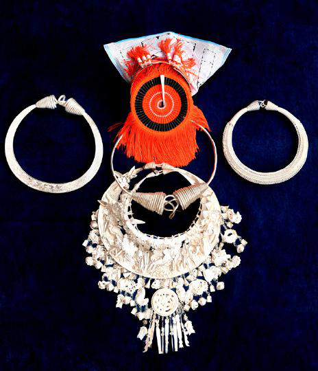苗族銀飾制作精巧,花樣古樸,富有想象力,且種類繁多,主要有銀角、銀冠、銀項(xiàng)圈、圍腰鏈、銀手鐲、銀衣片等100多種。即使同一品種,紋飾也各有千秋。