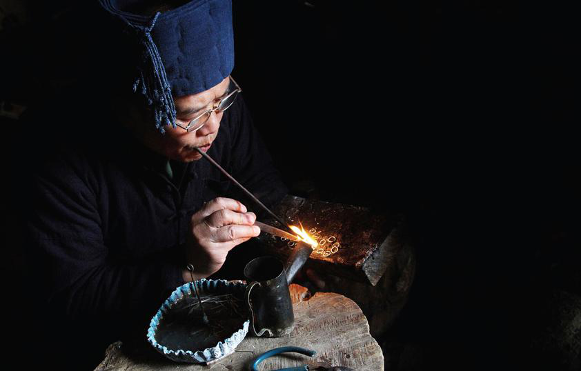 銀飾鍛制是苗族民間獨(dú)有的技藝,所有飾件都通過手工制作而成。銀飾的式樣和構(gòu)造經(jīng)過了匠師的精心設(shè)計,由繪圖到雕刻、制作有30道工序,包含鑄煉、捶打、編結(jié)、焊接、洗滌等環(huán)節(jié),工藝水平極高。