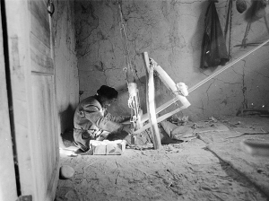 紡線車高約80厘米,寬約60厘米,長約22厘米。紡線車也和切克曼一樣古老,完全靠手工搖,沒有絲毫機械動力。老人紡線時,右手搖動紡線機,左手慢慢放絨,把比普通棉紗線粗兩三倍的絨線纏繞在錠上。這個工序叫做加捻和卷繞。隨著紗條抽長拉細,纖維變得更加平直,紗條強力下降,容易斷裂或延伸,因此需要加上適當捻度使其具有一定的強力。這個過程結(jié)束后,老人起身說:“經(jīng)過加捻和卷繞之后,要用水沖洗,晾干后就可使用了?!?/p>