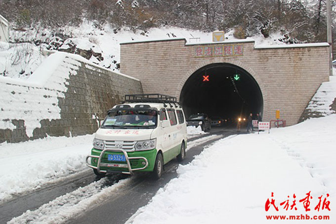 2014年4月獨(dú)龍江公路高黎貢山隧道貫通,農(nóng)村客運(yùn)車輛在鋪滿雪花的路上駛進(jìn)駛出