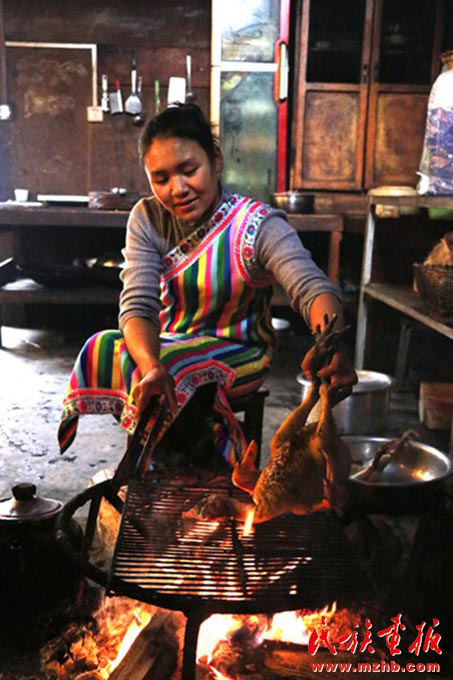 火燒獨(dú)龍雞是獨(dú)龍族人逢年過(guò)節(jié)團(tuán)圓飯不可缺少的一道特色菜(余金成 攝影)